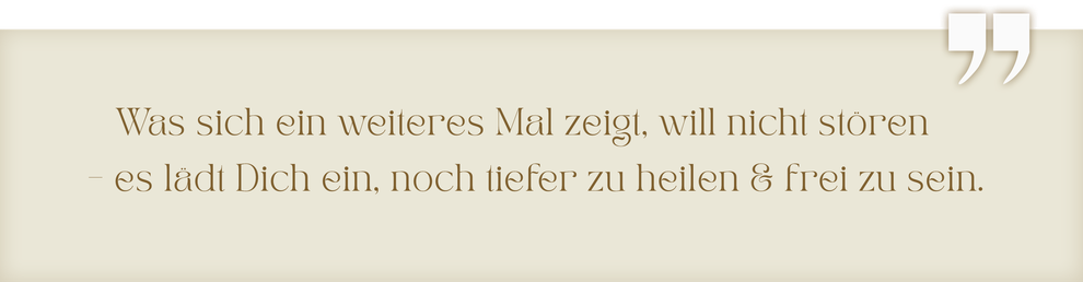 Blockaden, Emotionen und Muster, die seit unserem ersten Termin neu spürbar geworden sind, dürfen sich weiter lösen. Ich halte den Raum und lasse Heilung fließen.